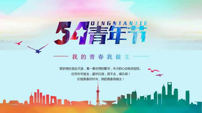 PPT模板使用了一张低平面风格的城市剪影背景图片。模板首页用飞鸟、我的青春我做主 等元素装饰。中间放置了 54青年节艺术字作为PPT标题文字。界面充满青春色彩。