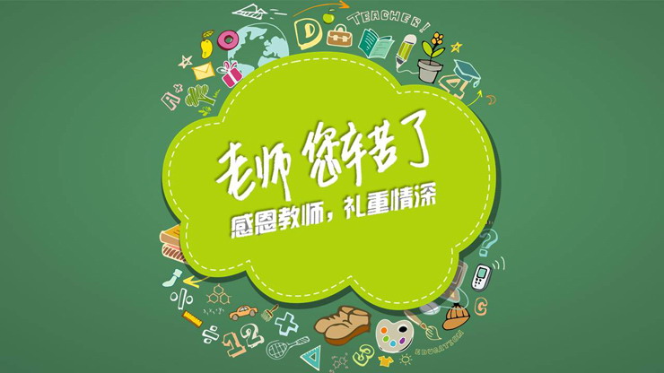 PPT模板使用了绿色径向渐变PPT底图。首页中间放置时尚UI设计的教育教学PPT图标,和手写体 老师您辛苦了PPT标题。