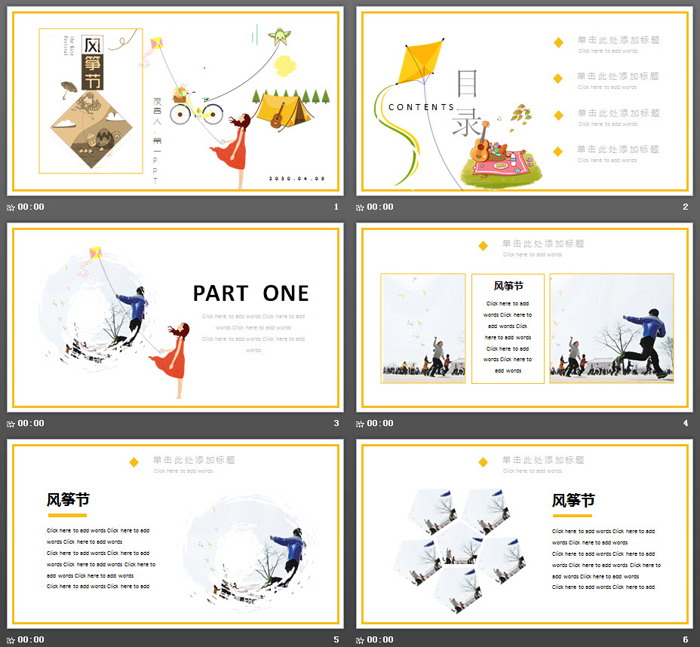 PowerPoint模板内容页,由21张黄色扁平化幻灯片图表,与风筝节放风筝PPT插图排版制作。