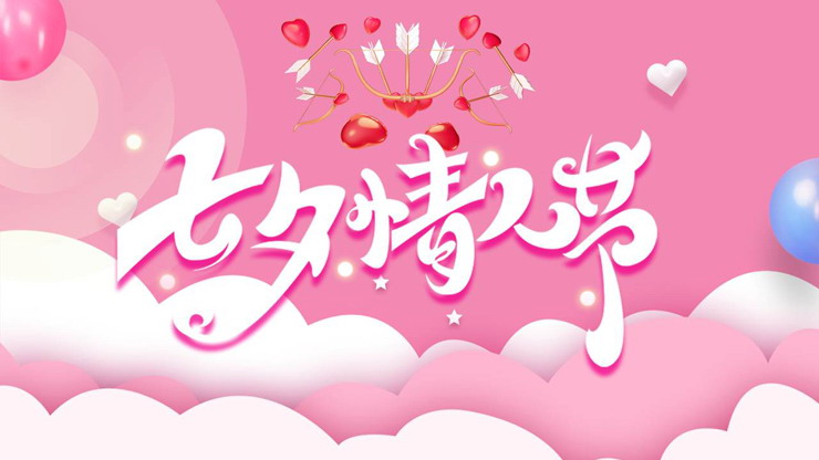 PPT模板首页,使用了白云图案、爱心图案、粉色彩球等背景图片。中介费昂志七夕情人节PPT艺术字。界面温馨浪漫。
