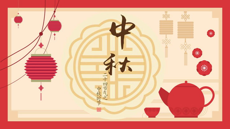PPT模板使用了红色作为主题色。首页使用了剪纸灯笼、花朵、茶具、月饼图案等背景。中间使用毛笔字书写中秋二字。界面古典喜庆。