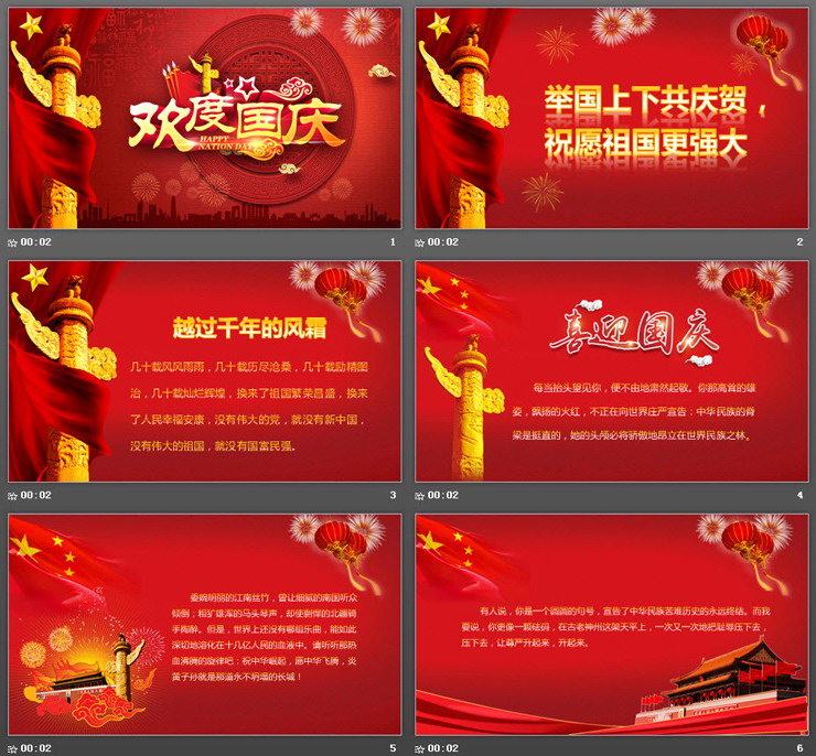 PPT模板以红色为主题色。首页使用了礼花、华表、红色彩带等背景图片。中间放置欢度国庆PPT艺术字。