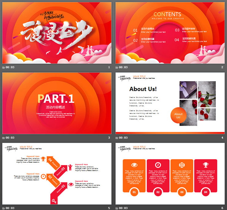 PowerPoint模板内容页,由18张橙色灰色配色的扁平化幻灯片图表,搭配活动策划文案排版。另外使用了玫瑰花PPT插图、情侣PPT插图、牛郎织女PPT插图等排版。