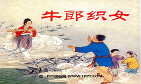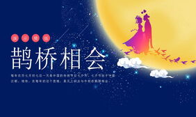PPT模板使用了卡通风格设计。首页为蓝色夜空下,牛郎织女约会在鹊桥的PPT背景图片。右下角放置白色PPT艺术字—鹊桥之恋。
