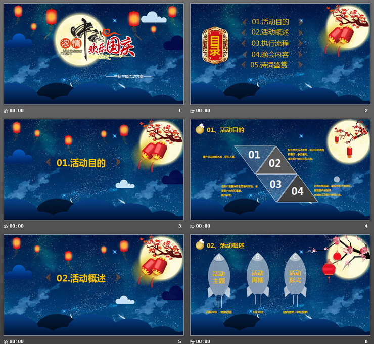 PPT模板使用了深蓝色夜空背景图片。PPT封面放置动态云朵PPT动画、孔明灯、圆月亮等平PPT背景图片。中间放置浓情中秋欢乐国庆PPT艺术字。界面卡通可爱。