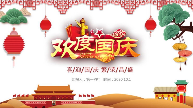 PPT模板封面使用了卡通松树、灯笼、群山、古典边框等背景图片。中间放置欢度国庆PPT艺术字。界面设计精美。