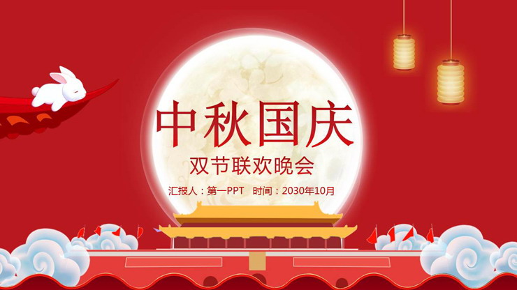 PPT模板使用喜庆红色主题色。首页放置卡通月亮、祥云环绕的天安门、睡觉的玉兔等背景图片。中间填写中秋国庆双节联欢晚会PPT标题。界面卡通可爱。