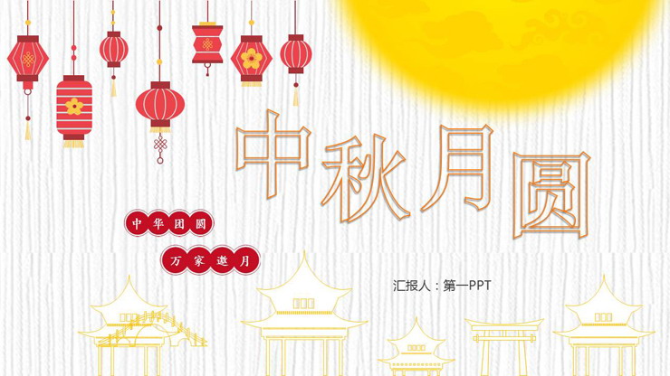 PPT模板封面,使用了多个样式的红色灯笼图案、月亮图案、楼阁轮廓图案等背景。右侧填写中秋节PPT标题。