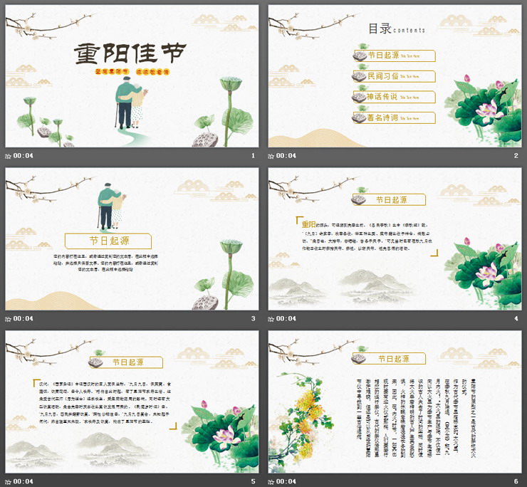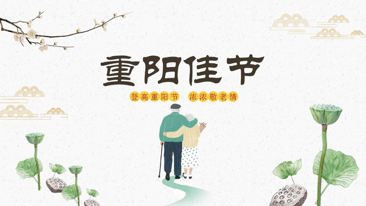 PPT模板封面,使用了群山、梅花、荷花,和两位互相搀扶的老年人PPT背景图片。中间放置重阳佳节PPT标题。界面古典雅致。