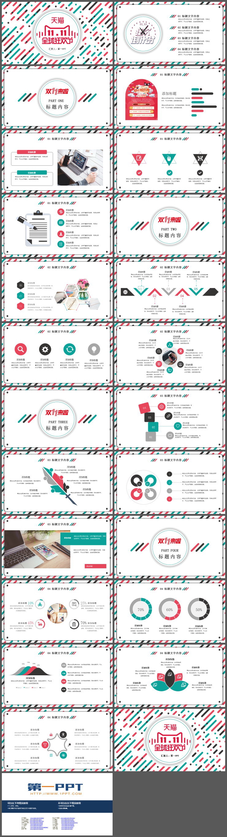 精致彩色斜线背景的双十一主题PPT模板,共25页;