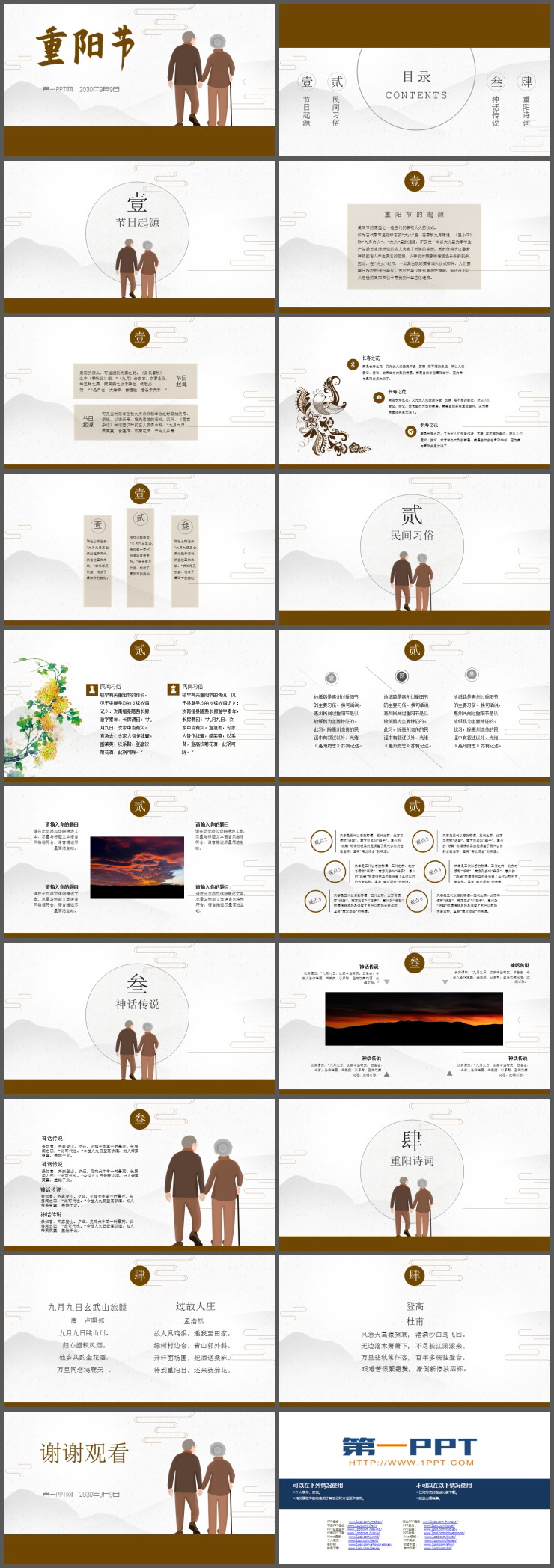 PPT内容页,由17张古典棕色图表,与关于重阳节的诗词,和民间风俗介绍排版制作。