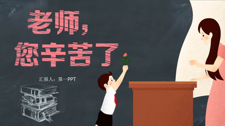 PPT模板封面,一位小学生手捧鲜花向讲台上的老师献花背景图片。左侧使用粉色粉笔字书写老师您辛苦了PPT标题。不禁让人想起小学时代的恩师。