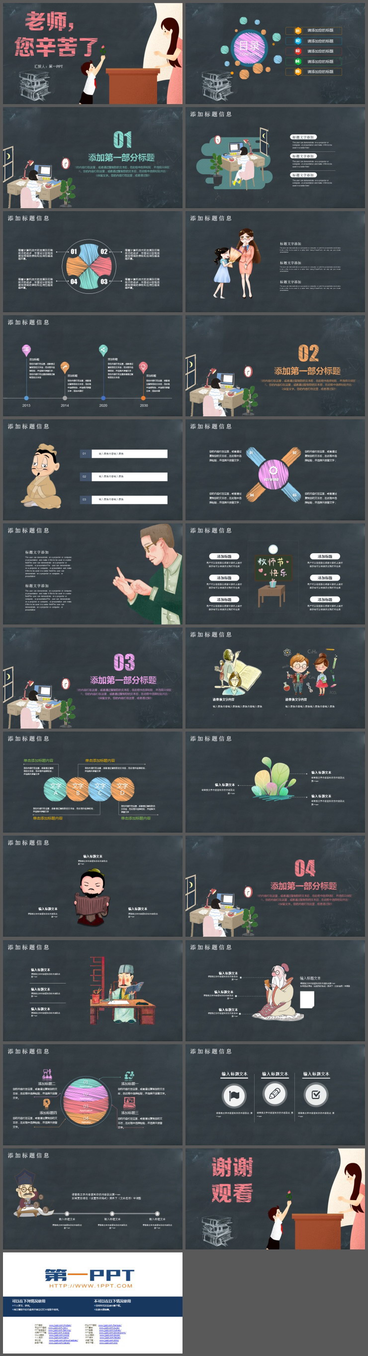 PowerPoint模板内容页,由多张卡通老师PPT插图、学生PPT插图搭配PPT文字排版。另外使用了多张彩色粉笔幻灯片图表辅助设计。