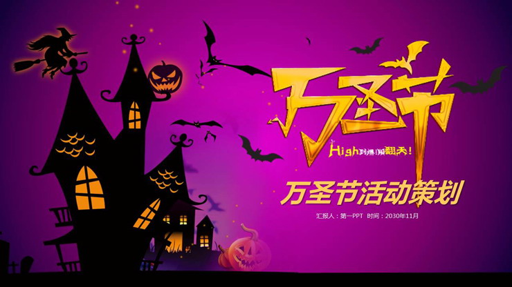PPT模板采用了紫色径向渐变背景色。封面放置鬼屋、南瓜、女巫、蝙蝠等背景图片。右侧放置金色万圣节PPT艺术字,下方填写万圣节活动策划方案PPT标题。界面神秘卡通。