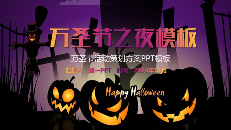 PPT模板使用了紫色渐变的夜空。PPT模板封面放置黑色南瓜灯、稻草人等背景元素。中间填写万圣节之夜PPT标题。界面充满神秘感与恐惧感。