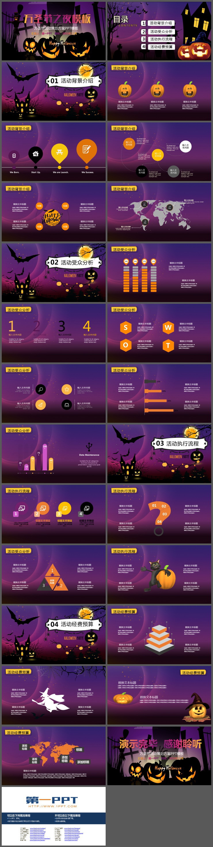 神秘紫色背景的万圣节之夜PPT模板,共26页;