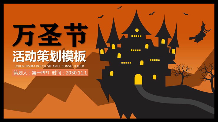PPT模板使用了橙色渐变底图。PPT封面放置了黑色城堡、飞行的女巫、蝙蝠等背景元素。左侧填写万圣节PPT标题。