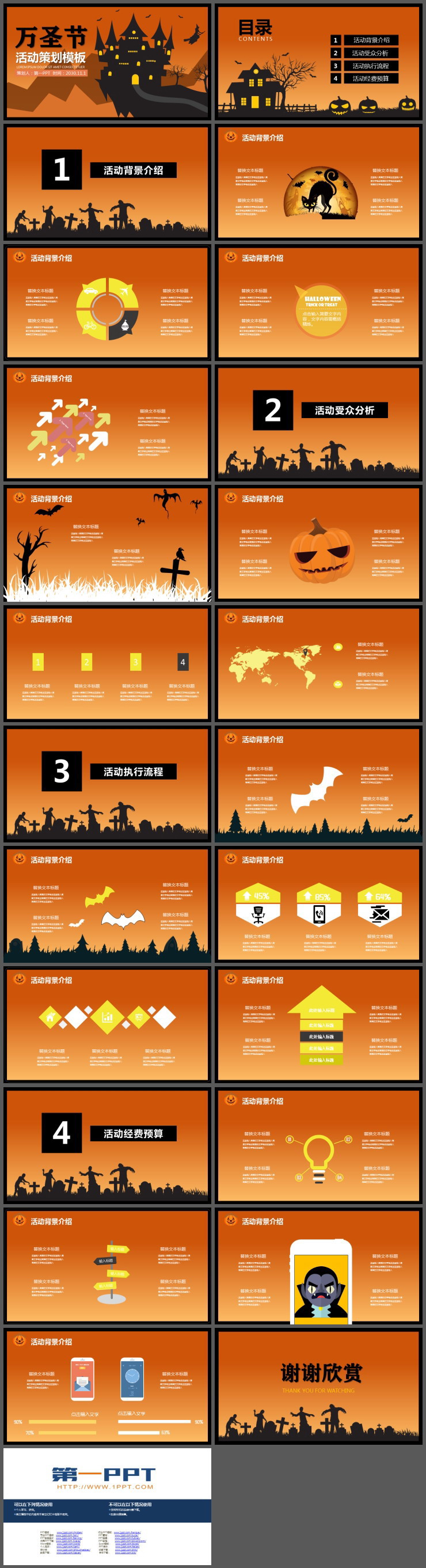 PowerPoint模板内容页,由22张黄色与白色搭配的幻灯片图表,与PPT文字排版。另外使用了墓地、丧尸、南瓜灯等黑色剪影装饰。