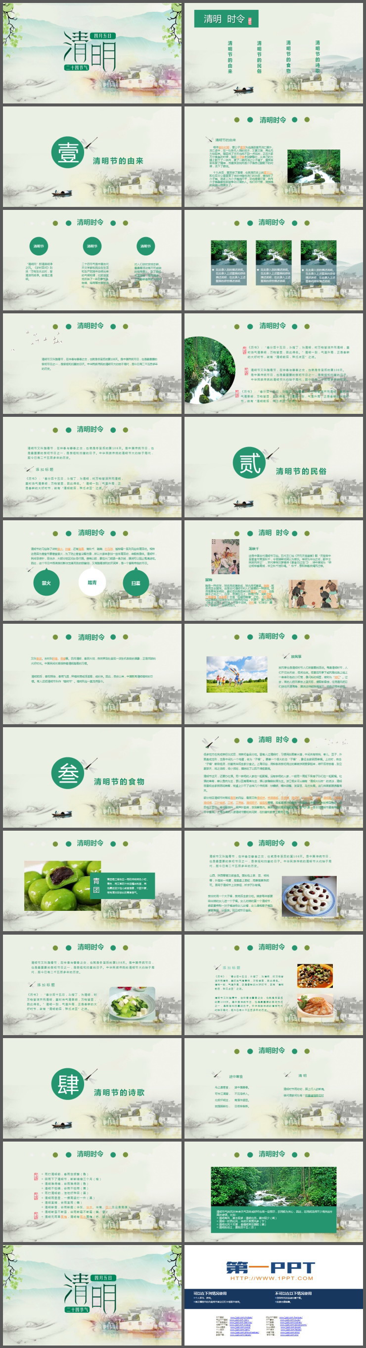 PowerPoint模板内容页,使用了清明时节的自然风景插图、活动插图、饮食插图等,搭配节气介绍文字排版。