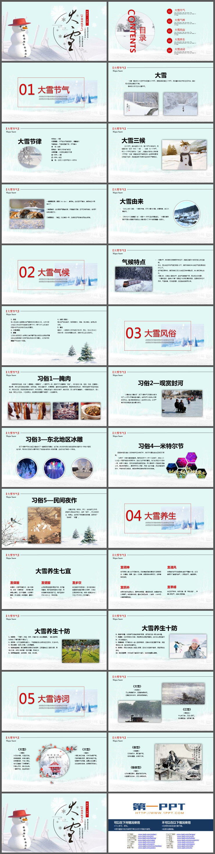 冬季雪人背景的大雪节气介绍PPT模板,共27页;