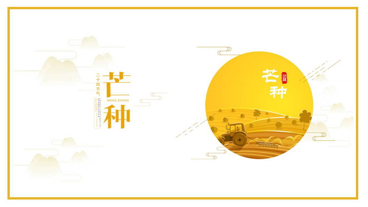 PPT模板使用了金色作为主题色。PPT封面使用了群山图案、卡通拖拉机农田耕种图案背景。左侧填写二十四节气之芒种PPT标题。界面简洁大气。