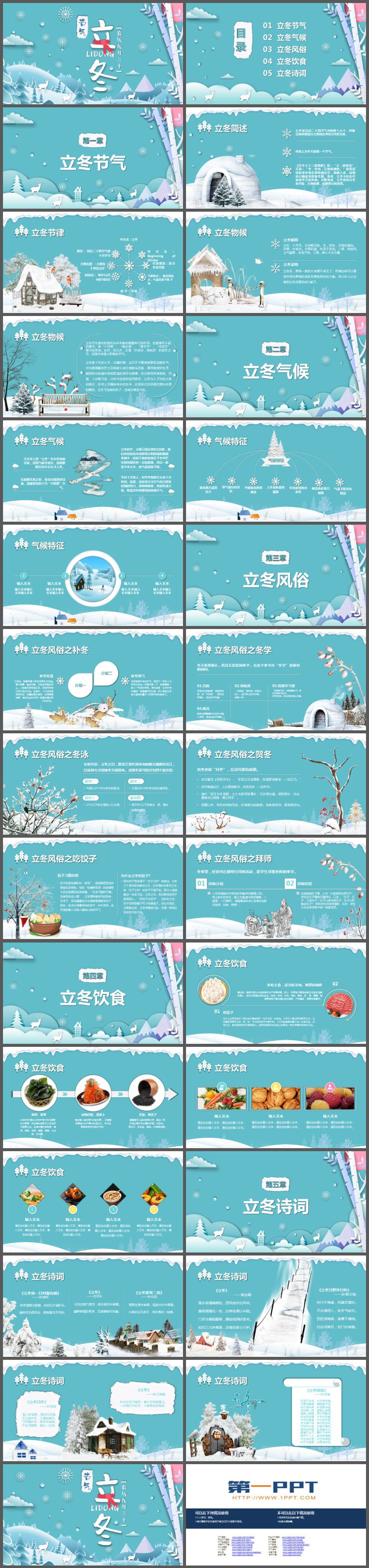 PowerPoint模板内容页,使用了多张冬天的雪景、房屋、动物、冬天美食等,搭配立冬介绍文字排版。