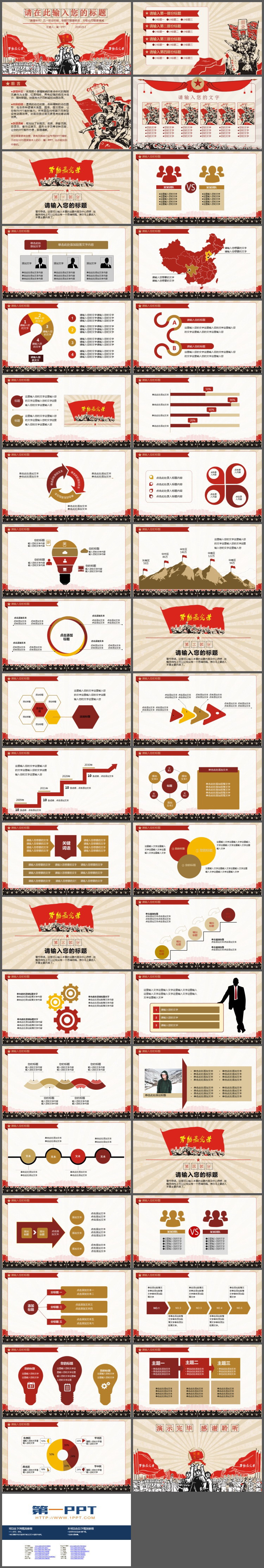 PowerPoint模板内容页,由38张红色土黄色配色的幻灯片图表,搭配PPT文字排版。另外使用了多张劳动的工农兵等PPT插图装饰。