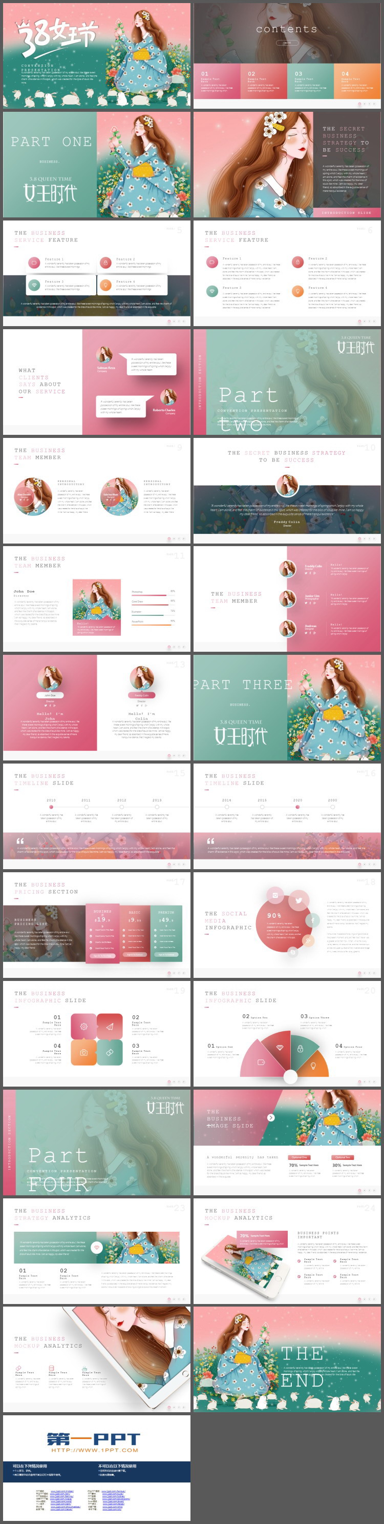 PowerPoint模板内容页,由24张红色、绿色、粉色配色的幻灯片图表,搭配PPT文字排版。另外使用了多张水彩女生PPT插图装饰。