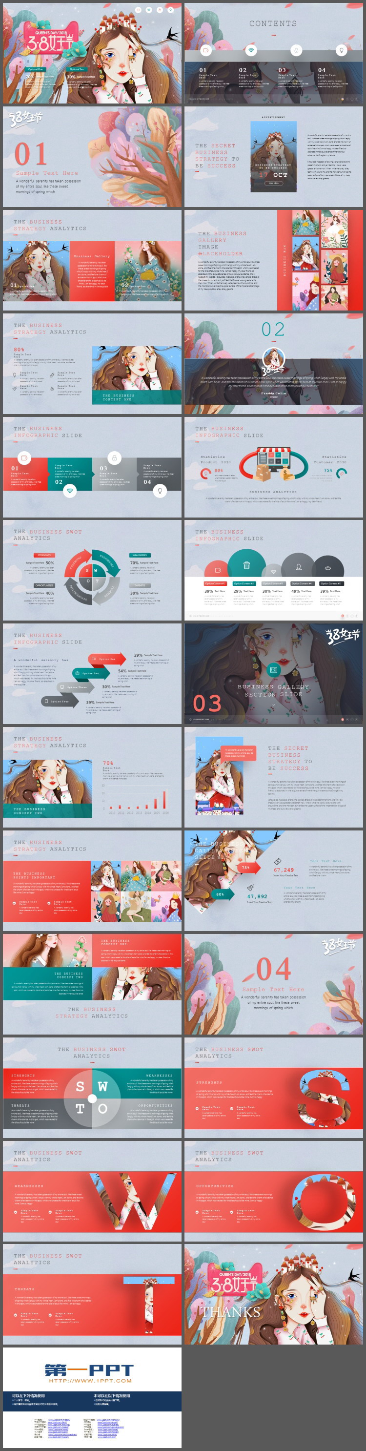 PowerPoint模板内容页,由24页彩色图表,搭配女王节文案排版。另外使用了多张水彩女生PPT插图装饰。