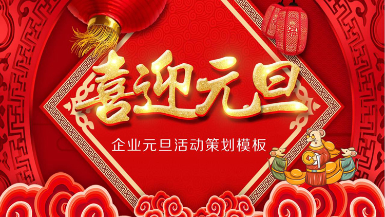 PPT模板封面使用了红灯笼、祥云图案、带有光影质感的喜迎元旦PPT艺术字。右下角的插图可以用新年生肖图案替换。界面精致喜庆。