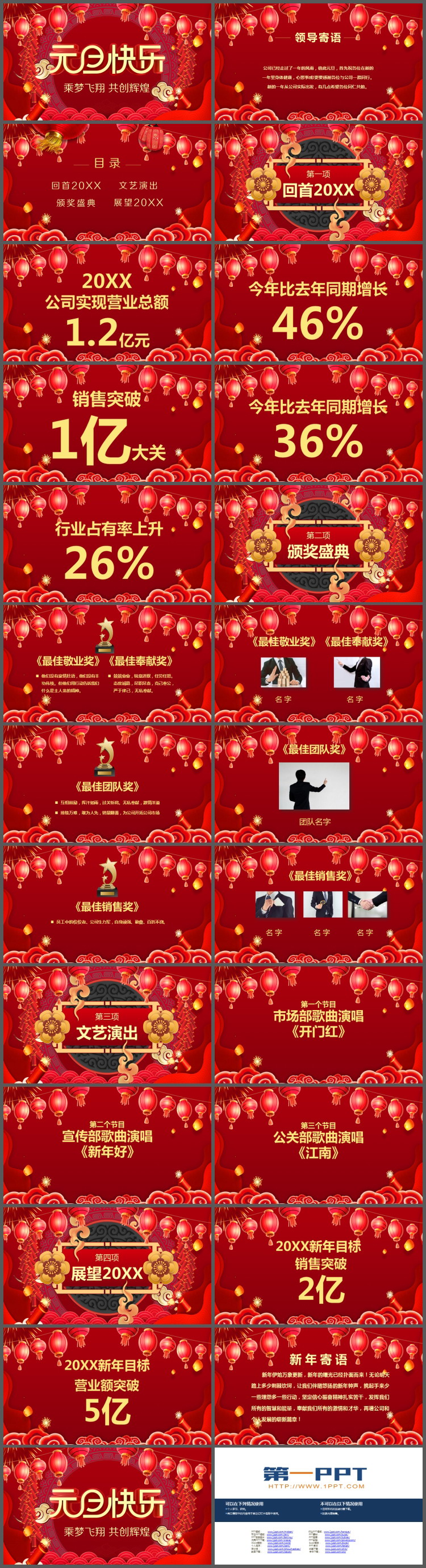 这是一套灯笼鞭炮背景的元旦快乐PPT模板,共25页;