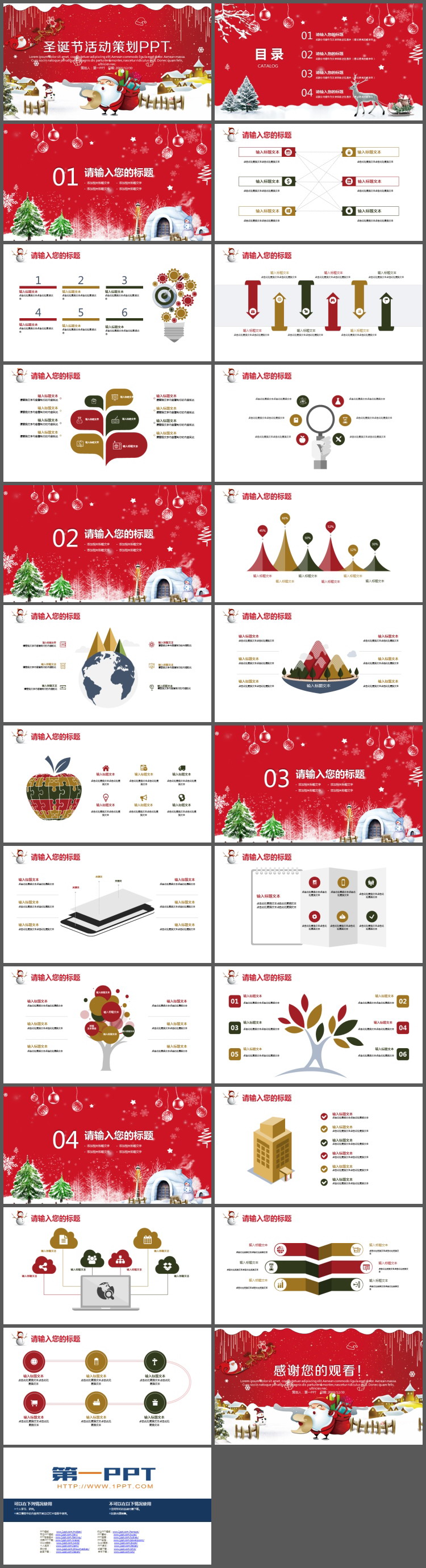 PowerPoint模板内容页,由22张彩色幻灯片图表,搭配PPT文字排版。另外使用了驯鹿雪橇等插图装饰。每页都带有动态PPT动画线条。