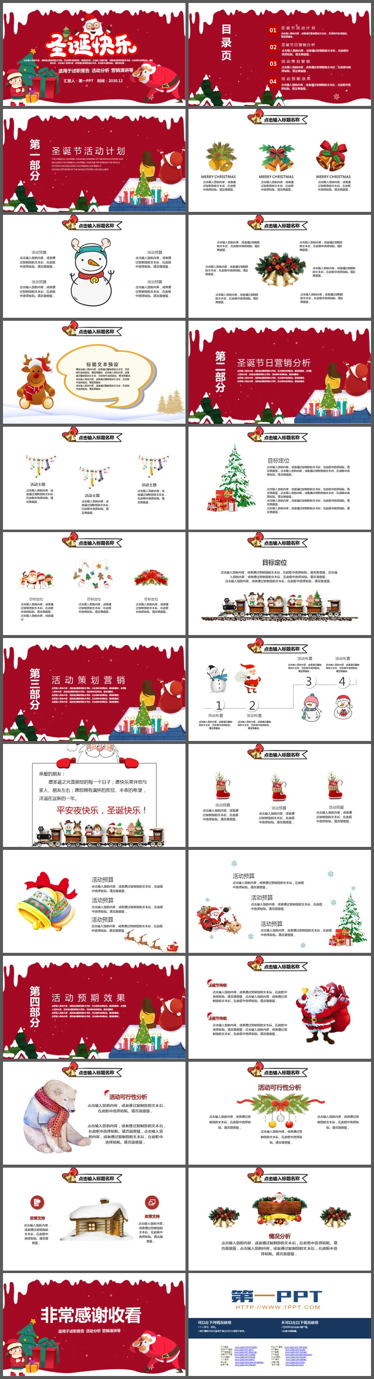 PowerPoint模板内容页,由23张红色动态幻灯片图表,搭配PPT文字排版。另外使用了圣诞铃铛、卡通小动物、雪屋、雪人、圣诞小火车、圣诞树、圣诞礼物等装饰。