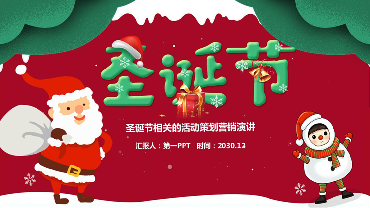 PPT模板封面使用了圣诞老人、雪人、圣诞礼物背景图片。中间放置绿色 圣诞节PPT艺术字标题。界面卡通可爱。