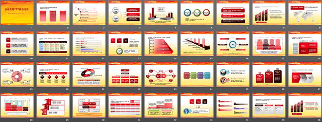 模板首页用红色、黄色作为主色调,党政气息浓厚,内容采用了多种关系图表,适合用于政府机关,以及国庆节、建军节幻灯片的制作。