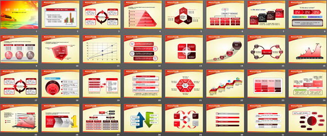 本套模板以红黄作为主色调,内容包含各种关系:并列关系,聚合、扩散关系,层级关系等的幻灯片图表,适用于政府部门工作汇报幻灯片的制作,或者用于行政管理PPT制作,喜庆节日例如建党节PPT的制作。