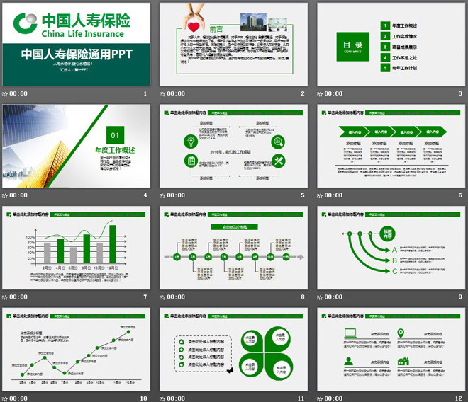 关键词:绿色扁平化幻灯片模板,动态保险公司PPT模板,大气中国人寿PowerPoint模板免费下载,.PPTX格式;