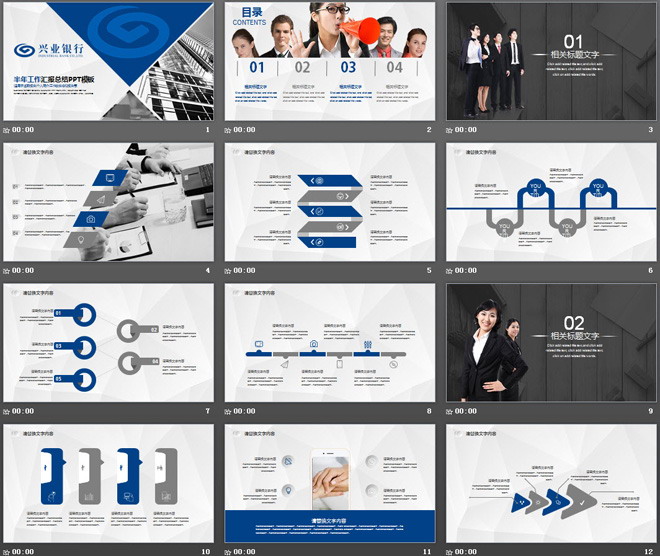 关键词:蓝色扁平化银行PPT模板,动态兴业银行年中工作总结PPT模板,.PPTX格式;