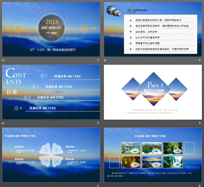 这是一套蓝色模糊云海背景的,旅游行业数据分析PPT模板,共20张。第一PPT模板网提供精美旅游相关幻灯片模板免费下载;