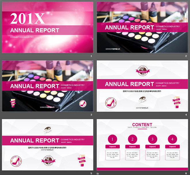 关键词:粉色光晕幻灯片背景图片,动态美容彩妆PPT模板,粉色扁平化PowerPoint图表,.PPTX格式;