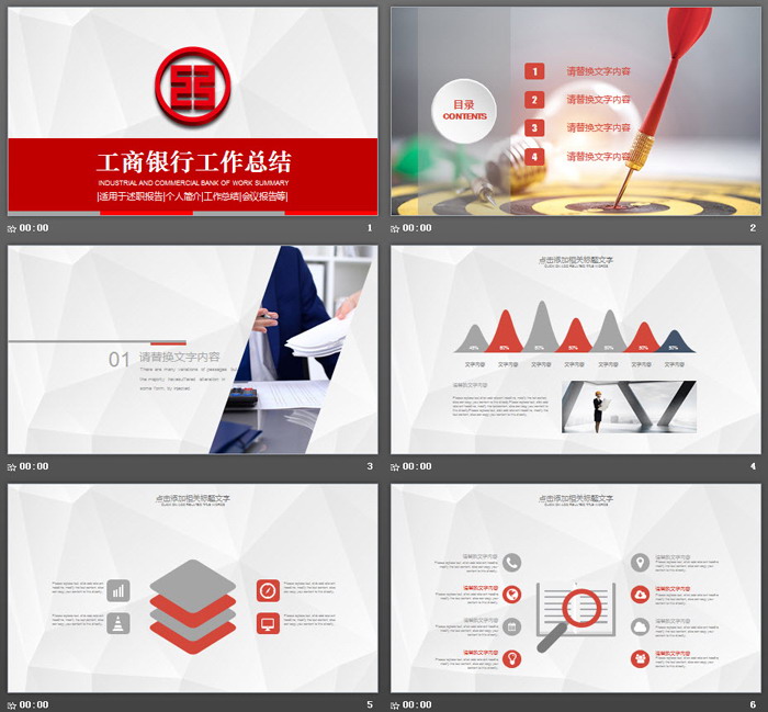 关键词:工商银行标志幻灯片背景,红色灰色搭配扁平化PowerPoint图表,动态工商银行专用PPT模板,.PPTX格式;