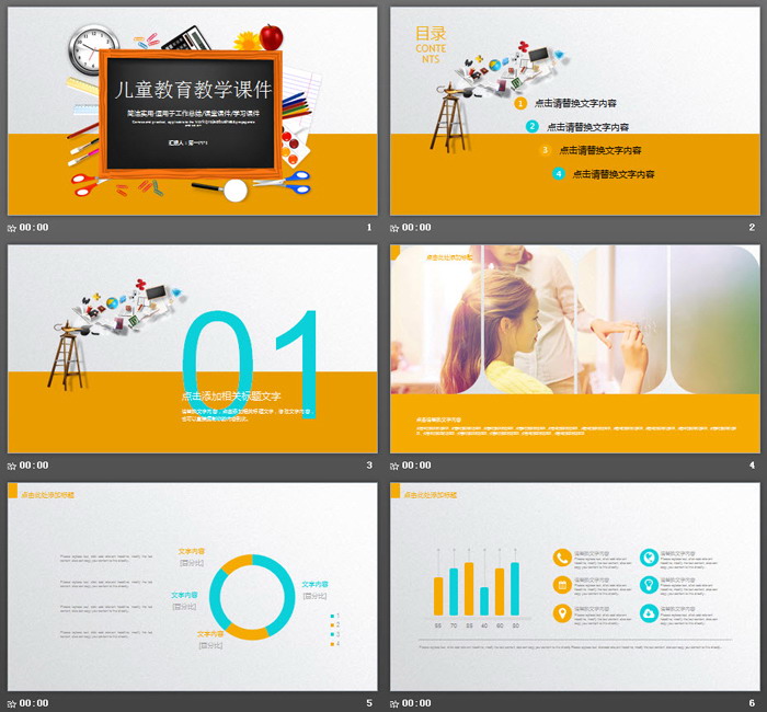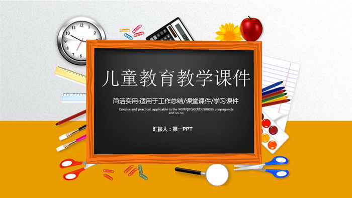 关键词:黑板、钟表、绘画工具幻灯片背景图片,蓝黄扁平化PowerPoint图表,动态儿童美术PPT模板,.PPTX格式;