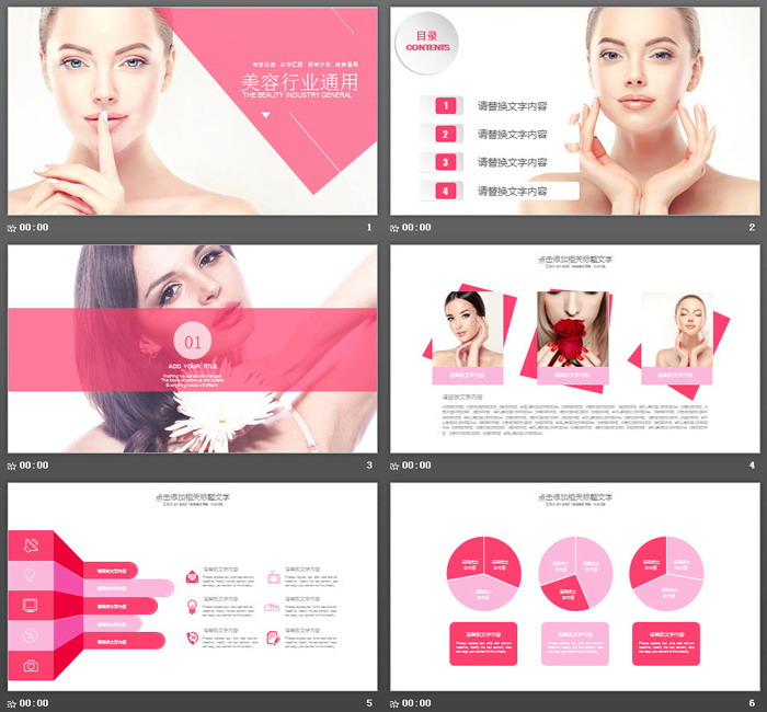 PowerPoint模板内容页面,使用粉色扁平化设计。部分页面,使用了化妆美丽的美女图片进行排版。