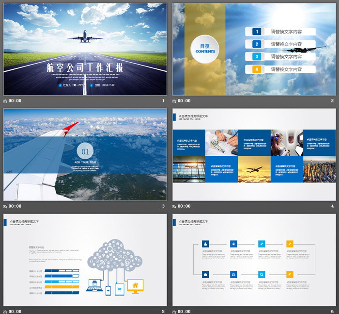 这是一套飞机起飞背景的航空公司工作汇报PPT模板,共22张。