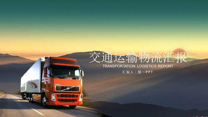幻灯片模板封面,使用了一辆行驶在崇山峻岭中的,装在集装箱的大卡车作为背景图片。非常具有视觉冲击力,与物流运输行业非常匹配。