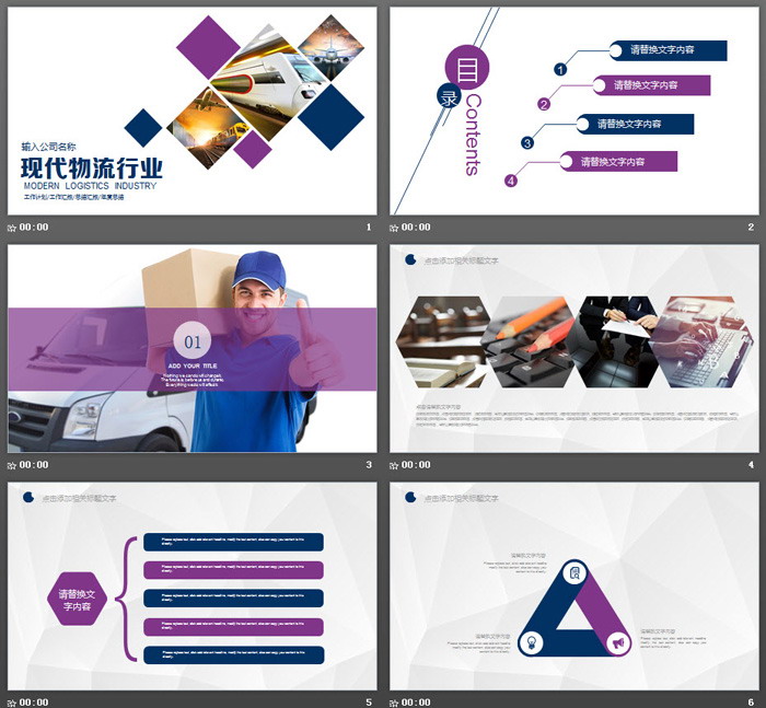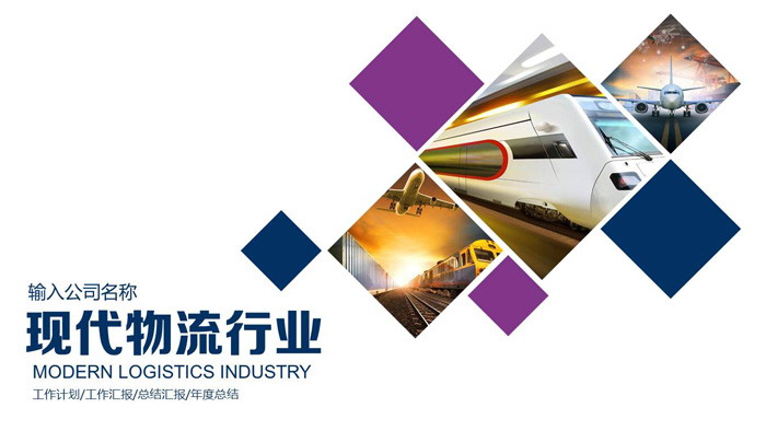 幻灯片模板封面使用了多个蓝色与紫色色块,搭配一些物流运输的交通工具,如:飞机、高铁等。作为背景图片。使得幻灯片模板与物流行业主题非常贴切。