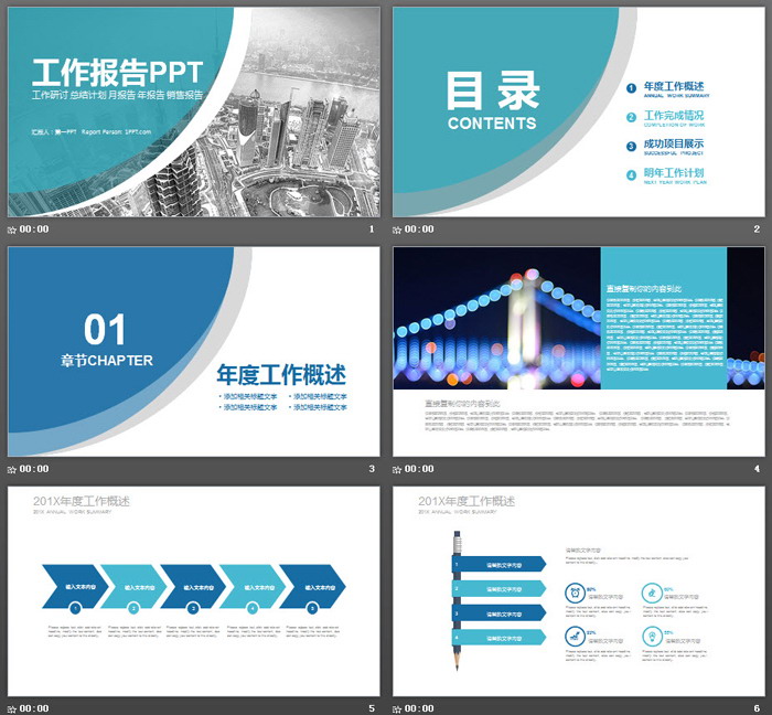幻灯片模板封面,使用了一张黑白城市楼盘建筑图片作为PowerPoint背景图片。上方使用了一个蓝色扁平化半圆图形作为背景,填写工作总结PPT标题。