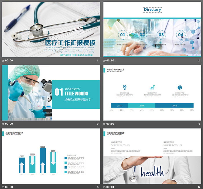 PPT模板内容页面使用了蓝色扁平化风格设计了20张幻灯片图表。搭配多张医生看病、诊断、化验等图片素材排版。