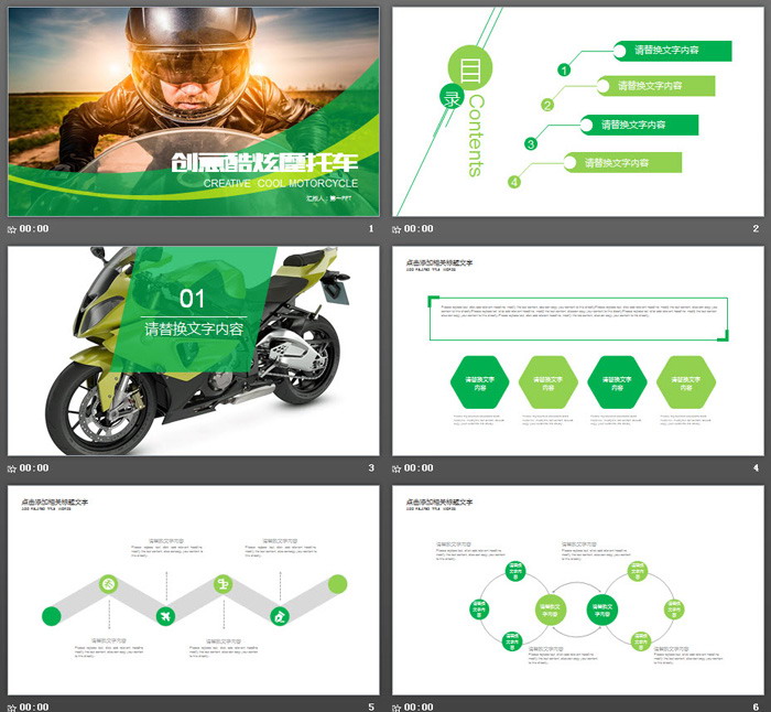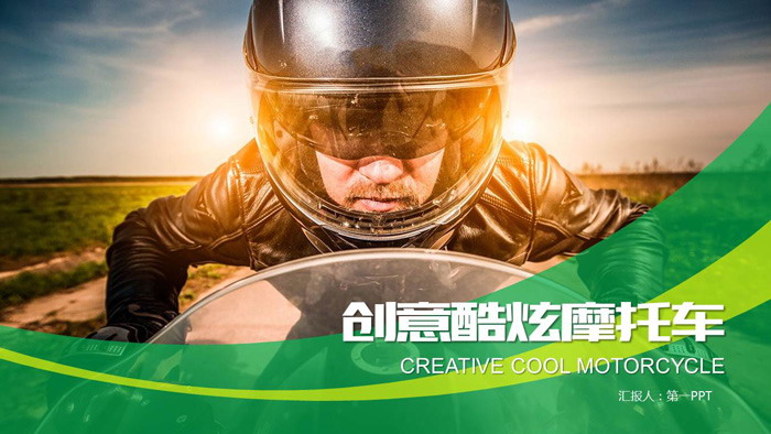 幻灯片模板使用了一张摩托车手骑行拉风摩托车的图片作为背景。整个PowerPoint模板以绿色为主色调。