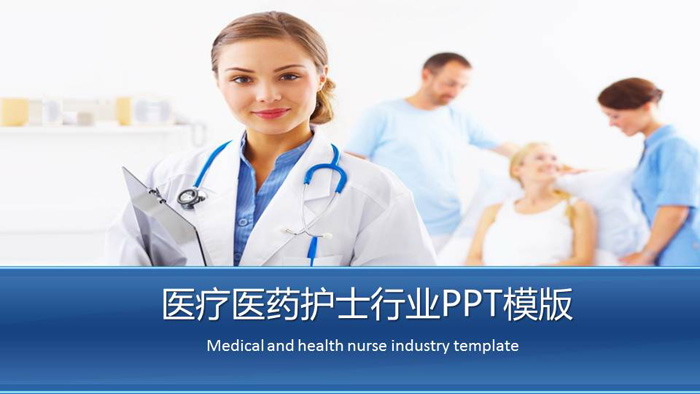 幻灯片模板封面使用了一张查房医生作为背景图片,后面是护士和病人图片。
